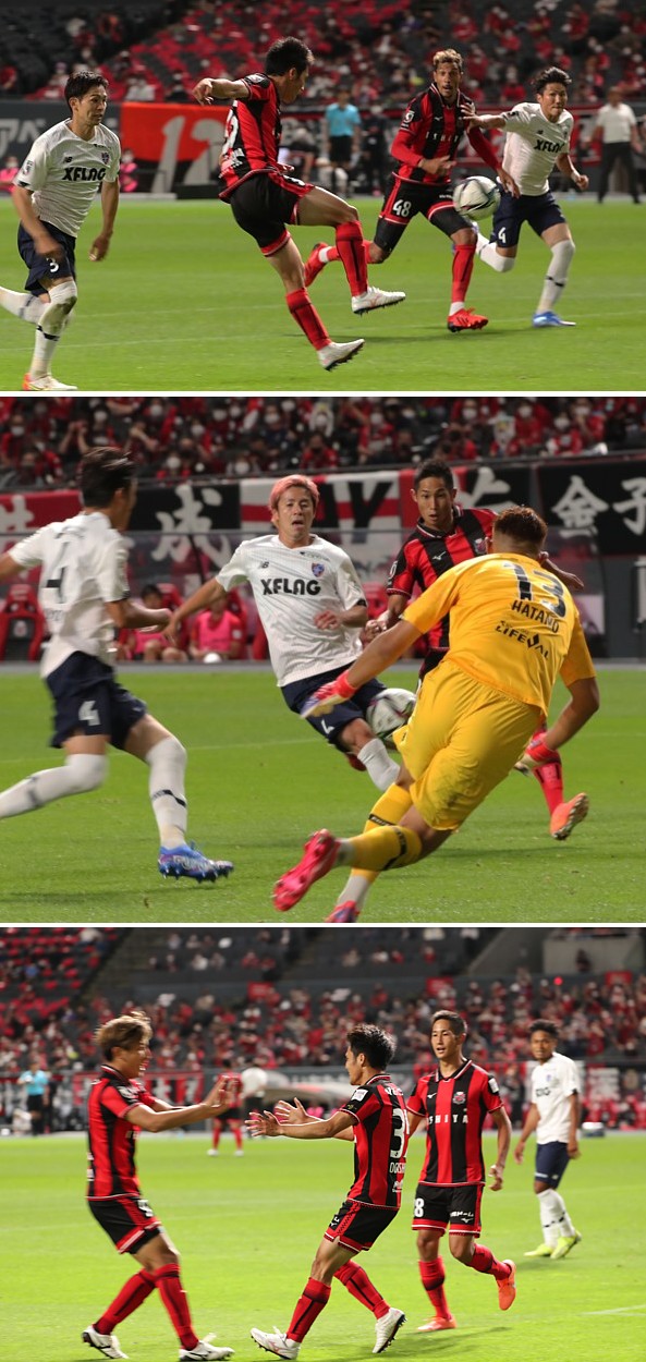 上:上段写真/後半4分の同点場面(上・中・下段3枚連続)、札幌DF福森のロングフィードをFW小柏(手前)ワンタッチで落とし、(中段写真)MF青木のゴールをアシストする。左東京DF森重(3番)、右端渡辺剛(4番)、後半から出場した札幌FWジェイ(48番)もゴール前に走り込んでいる