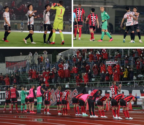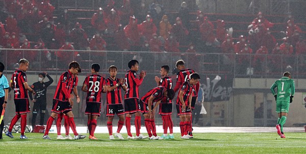 上:下段写真/0−2と完敗ながらゴール裏の赤いレインコートのサポーターから札幌の選手に温かい拍手が送られた