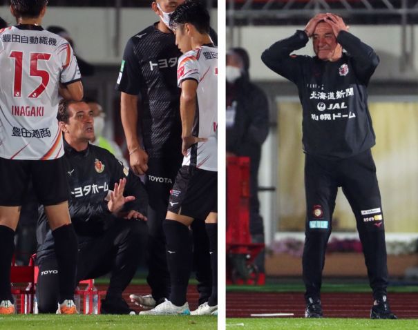 上:下段写真/後半8分、札幌DF福森がボールを奪われた時、ペトロビッチ監督が頭を抱えた