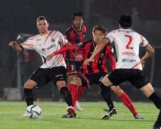 上:下段写真/前半35分、札幌MF菅(左)が名古屋陣内に切れ込む、その後ろでペトロビッチ監督も一緒にプレーしているように体を動かしている