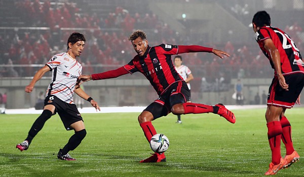 上写真/前半43分、札幌FWジェイ(中央)が名古屋DF宮原(6番)を抑えながらボールをコントロール、右MF青木(28番)、ジェイは4試合ぶりの先発とあって、気合は入っていたが得点できなかった
