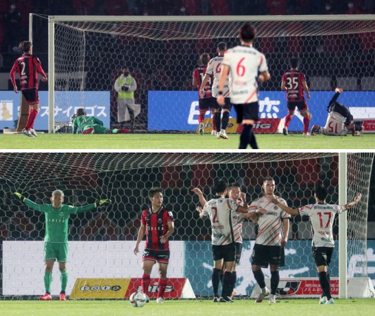 上:上段写真/前半45分、名古屋MF稲垣(15番)が、FW前田の左からのクロスにヘディングで合わせ2点目を入れ、勢い余ってでんぐり返りする。左端札幌DF田中(2番)、その右GK菅野(1番)