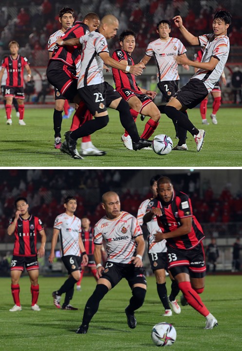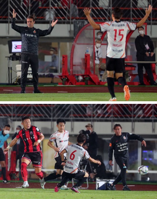 上:上段写真/前半18分、札幌、名古屋のFW同士、ジェイとマテウスのマッチアップがあり、両手を掲げる名古屋のマッシモ・フィッカデンティ監督、なぜかピッチのMF稲垣も同様のポーズ