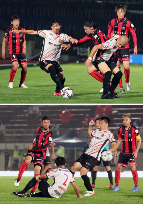 上:上段写真/後半41分、名古屋MF長澤(5番)と吉田(右手前)の間に割って入ってボールを奪いに行く札幌MF荒野、左端MF金子(9番)、右後方DF田中
