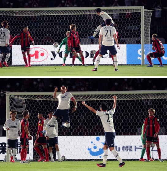 上:右側写真/後半35分、逆転ゴールを決めた札幌MF荒野(27番)がピッチに戻って仁王立ち