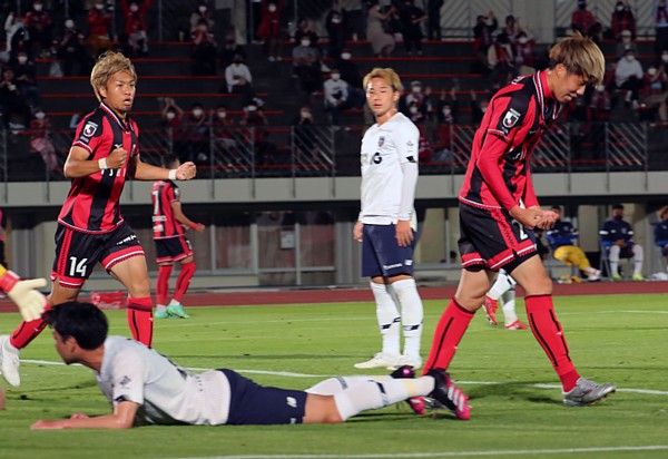 上:下段写真/前半14分、キャプテンマークを巻いた東京DF渡辺剛がシュートの時よりも高いのではと思わせるジャンプで喜びを表現、その右MF青木(21番)、右端ぼう然とする札幌DF田中(2番)、その奥GK菅野。他の選手は左から東京DF岡崎(29番)、札幌MF菅(4番)、DF宮澤、東京FW高萩(8番)