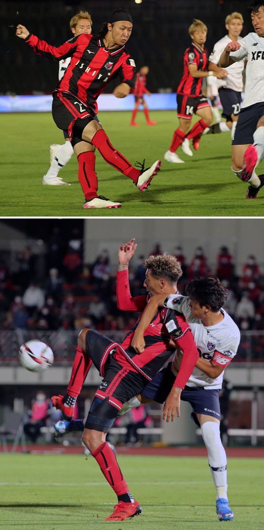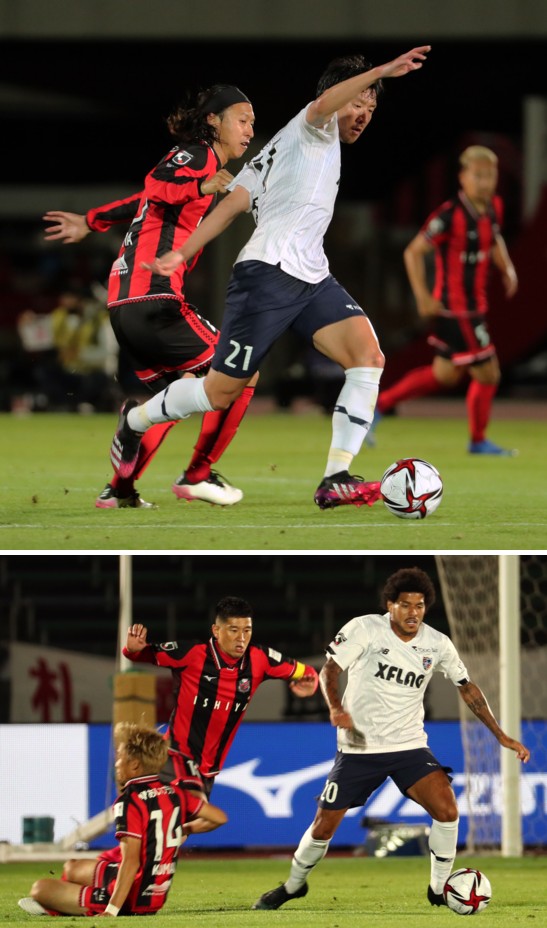 上:上段写真/後半37分、ボールを持った東京MF青木(21番)に激しく詰め寄る札幌MF荒野(左)