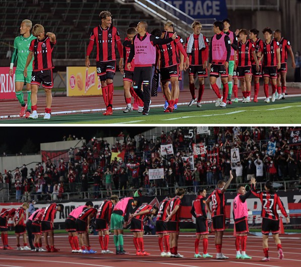 上:上段写真/FC東京に2−1と逆転で先勝しサポーターへのあいさつに向かう札幌の選手たち、FWジェイ(48番)とMF小野がにこやかに話し合っている