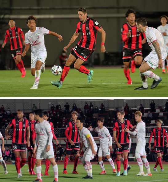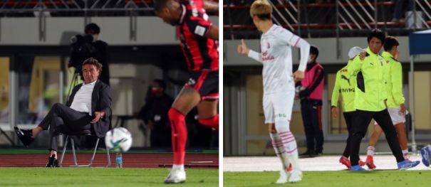 上:左側写真/後半45分、椅子に座ったままの札幌のペトロビッチ監督、右はFWドゥグラス・オリヴェイラ