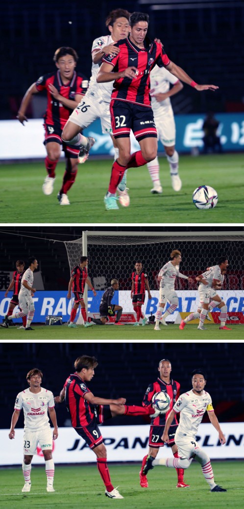 上:上段写真/後半追加タイム6分、何とか一矢報いようとボールを運ぶホーム初登場、後半最初から出場している札幌FWミラン・トゥチッチ(中央)がボールを運ぶ、その左C大阪MF乾、右端DFチアゴ