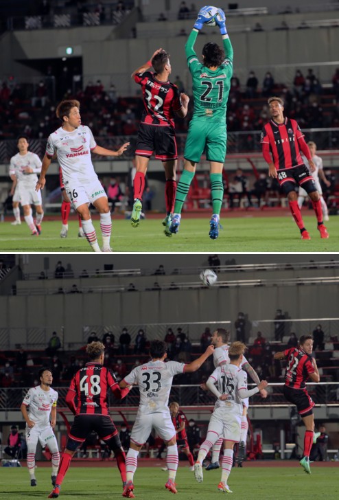 上:上段写真/後半34分、札幌MF金子が左からクロスを上げるがC大阪GKキム・ジンヒョン(21番)にキャッチされる、札幌FWミラン・トゥチッチ(32番)、ジェイ(48番)は触れず、左端C大阪DF小池(26番)