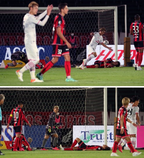 上:下段写真/後半43分、C大阪FW大久保に3点目を決められガックリの札幌の選手たち、左からMF宮澤(10番)、その奥DF田中、厳しい表情のGK菅野、大久保のシュートを止められなかったDF高嶺はピッチに倒れたまま