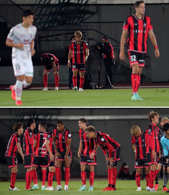 上:下段写真/試合終了後のあいさつをする札幌の選手たち、左からMF金子(9番)、DF柳、MFルーカス・フェルナンデス(7番)、DF高嶺、FWドゥグラス・オリヴェイラ、ミラン・トゥチッチ、ジェイ、MF駒井(14番)、DF田中(2番)、GK菅野、外国人FW3人を並べても得点には至らなかった