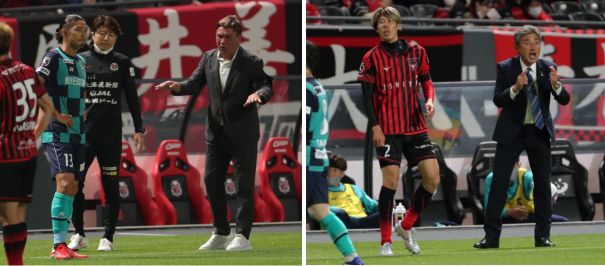 上:右側写真/前半18分、福岡FWブルーノ・メンデスに対する札幌MF金子のプレーに対し「見ていたか?」と言わんばかりのジェスチャーで主審に抗議する福岡の長谷部茂利監督、左は札幌DF田中(2番)