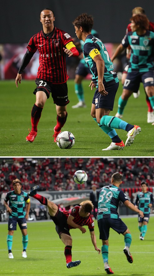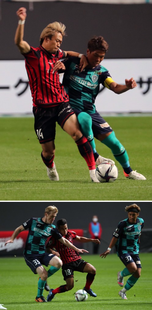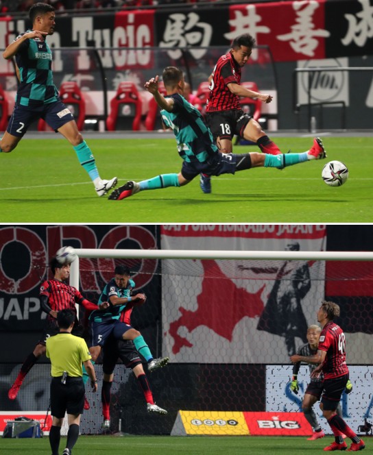 上:上段写真/後半26分、激しくマッチアップする札幌MF駒井(左)と福岡MF前、この場面は前がボールを奪った