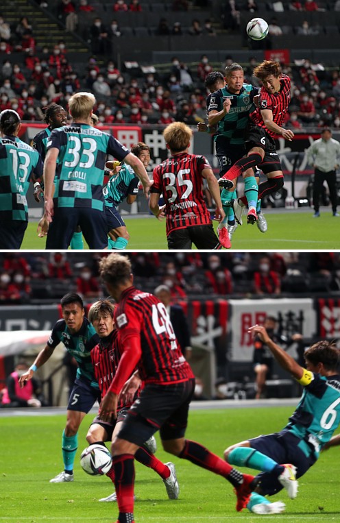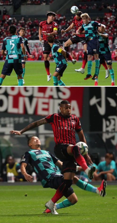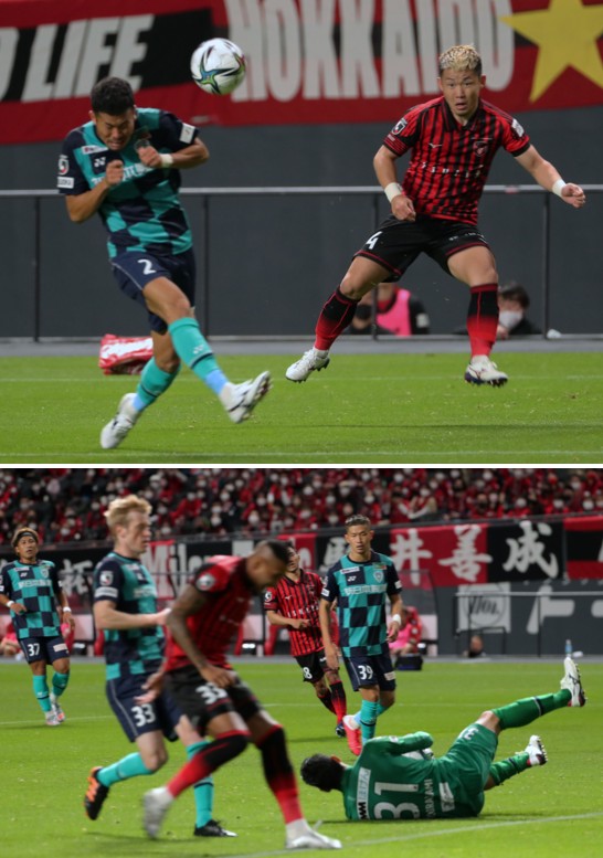 上:上段写真/前半39分、札幌MF青木の左CKからDF高嶺(6番)が、福岡DF奈良(39番)とヘッドで激しく競り合う