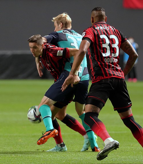 上:下段写真/後半35分、札幌MFチャナティップ(18番)が福岡DFドウグラス・グローリ(33番)、途中出場のMF金森(37番)に挟まれるようにボールを奪われる