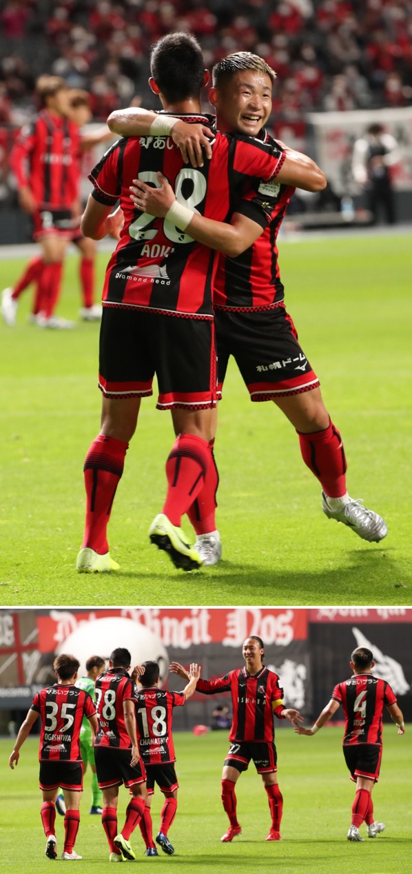 上:下段写真/前半20分、先制ゴールを決めた札幌MF青木(28番)に走り寄り、チャナティップ(18番)とハイタッチして笑顔を見せるキャプテンマークを巻いた荒野(28番)、右アシストした菅(4番)、左端FW小柏(35番)