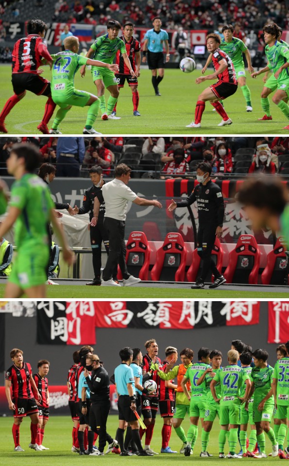 事無く「終了のホイッスル」と思いきや、審判団(主審と2副審)に、選手らが抗議。あいさつもしないで「選手同士のなじり合い」。結局、観衆に対してのあいさつもなしに「両陣営に分かれたまま」試合終了。「審判の行動に疑問を感じた観衆も多い」。