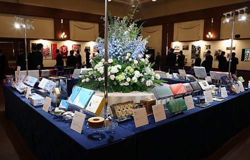 上写真/大広間の中央に石屋製菓のお菓子が並べられ、周囲の壁面に思い出の写真などが掲げられた