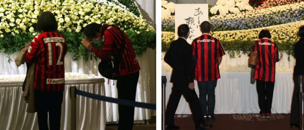 上写真/コンサドーレのユニフォームのレプリカを着て献花するサポーターたち