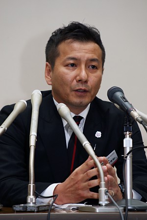 上写真/2013年3月22日の株主総会でチームを運営する株式会社北海道フットボールクラブ(2016年に現在の株式会社コンサドーレに社名変更)の社長就任会見であいさつをする野々村芳和氏