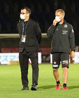 上写真/2021年9月8日のC大阪戦での野々村社長(左)。どの試合も、選手の後方からサポーターへのあいさつを欠かさなかった。