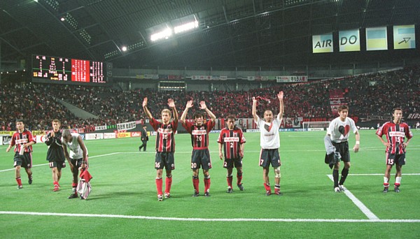 上写真/2001年11月3日、札幌ドームでのJ1・2ndステージ浦和戦を引き分けて残留を決定し、サポーターにあいさつするMF野々村(右から3人目)ら札幌の選手たち、懐かしい顔がいっぱいだ