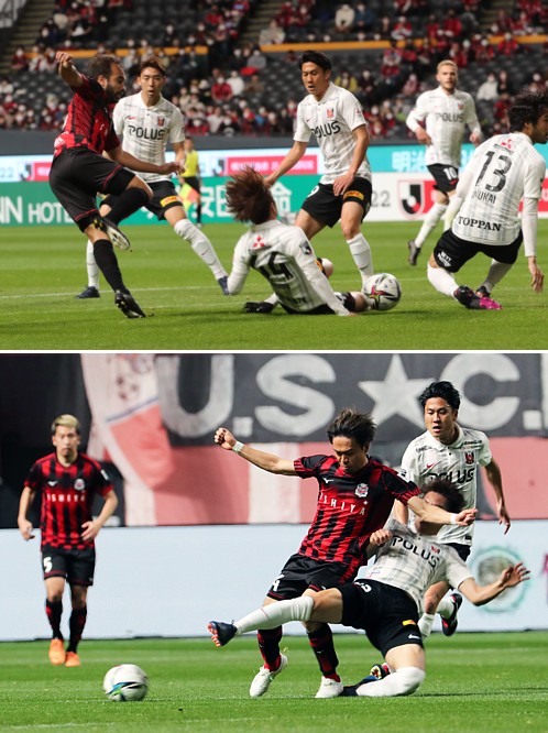上:上段写真/前半11分、左サイドの札幌MF菅からのクロスを受けてFWガブリエル・シャビエル(左端)がシュートを放つが、浦和DF大畑(44番)、犬飼(13番)らに阻まれる、中央MF岩尾