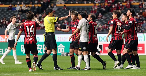 この後何が起きたのか。32分、荒野が大型スクリーンに「大写しになった」。主審・井上がVARの判定を待つ。「荒野が荒っぽく、足裏で踏みつけた」図は、まさに「レッドカード判定を映し出した」、目を覆いたくなる「レッド」での一発退場だった。