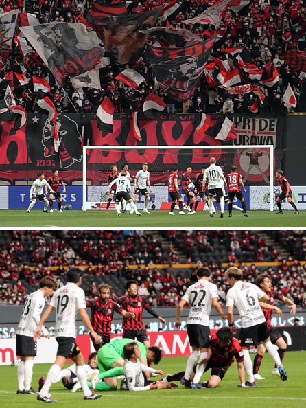 上:上段写真/後半8分、浦和の左FKからの攻撃を懸命に守る札幌の選手たち、浦和サポーターの応援の迫力はすごい勢いで、札幌の選手たちに重くのしかかる