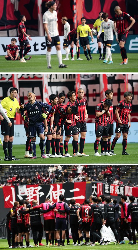 上:下段写真/ペトロビッチ監督の指示に従って異例の試合後の円陣を組む札幌の選手、スタッフたち