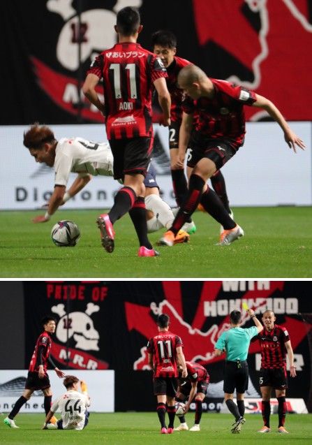 上:上段写真/後半21分、途中出場の札幌FW中島(右)が東京MF松木(左)を後方から倒してしまう、手前MF青木(11番)、後方DF田中