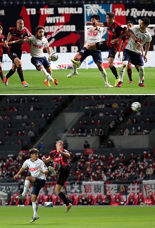 上:上段左側写真/後半39分、浮き球に札幌DF西(右)が飛びついてボールを前線に送る、左東京FWディエゴ・オリヴェイラ