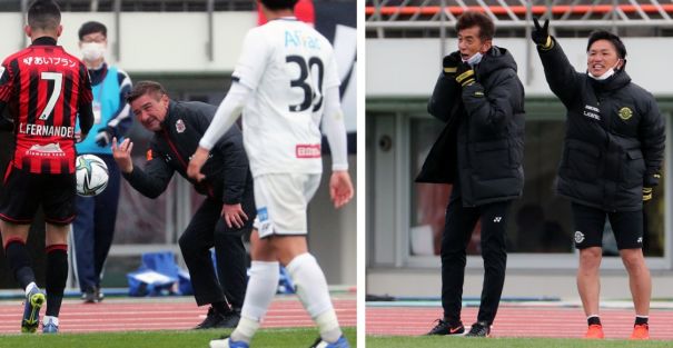 上:右側写真/後半追加タイム3分、同点とした直後、大声で選手を鼓舞する柏の監督代行、井原ヘッドコーチ(左)と、右の井上GKコーチは「あと2分」を示しているのか?