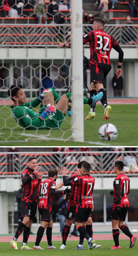 上:上段写真/前半14分、札幌FWミラン・トゥチッチ(23番)がDF田中のパスを受け先制ゴールを決め、倒れ込む柏GK佐々木、ミラン・トゥチッチは今季初得点