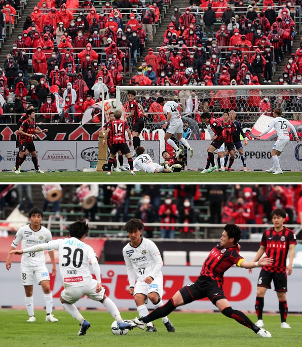 上:上段写真/前半12分、札幌FWミラン・トゥチッチ(32番)が柏MF加藤(30番)からボールを奪う、右端札幌MF深井