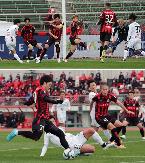 上:下段写真/前半13分、柏左FKからの攻撃を懸命に守る札幌の選手たち、左からFWミラン・トゥチッチ、DF田中、MF青木(11番)、DF岡村、GK菅野(1番)、柏の選手は左からMF升掛(38番)、FWアンジェロッティ(29番)、DF大南(25番)、右端上島(44番)