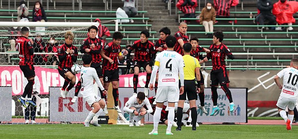 上写真/前列左からMF菅、ガブリエル・シャビエル、ルーカス・フェルナンデス、駒井、青木、後列左からGK菅野(1番)、DF田中、MF高嶺(6番)、FWミラン・トゥチッチ、DF岡村(50番)、MF深井(8番)、前の試合から4人の先発が変わり、守護神・菅野が起用された