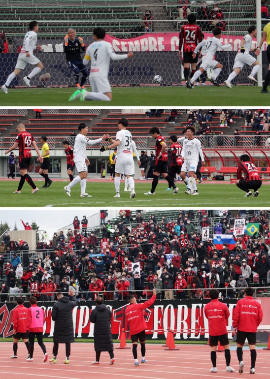上:下段写真/信じられない逆転負けで、あいさつに来た札幌の選手たちに、ゴール裏サポーターも複雑な表情