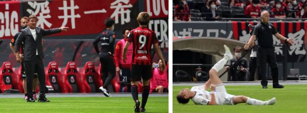 上:左側写真/前半10分、札幌DF福森のレッドカードでの退場が確定し、MF金子(9番)にフォーメーションの変更を指示するペトロビッチ監督