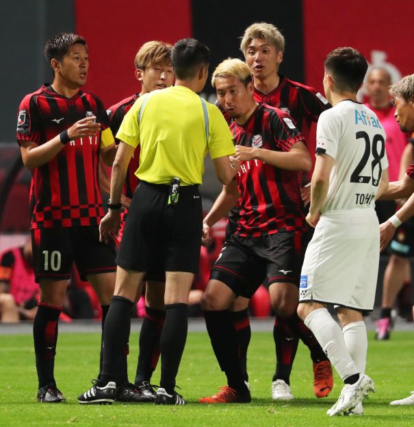6から8分、ゲーム中断。岡部主審がVARの画面を見に「第4の審判」の近くのモニターを見る。グラウンドで倒れた小屋松の脇に立つ福森。10分、主審のポケットから「赤札」が、福森に挙げられた。札幌キャプテン宮澤らが、審判に「抗議」するが、福森は「苦笑い」しながらピッチを去った。