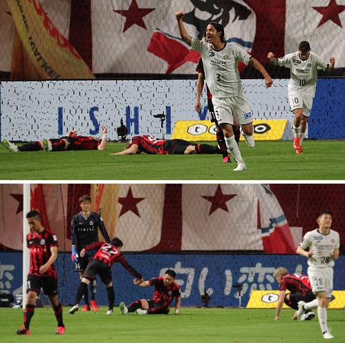 上:上段写真/前半15分、先制ゴールを決めガッツポーズして喜ぶ柏DF高橋(3番)、その右MFマテウス・サヴィオ(10番)。守り切れなかった札幌MF菅が仰向けに、DF中村がピッチに突っ伏している