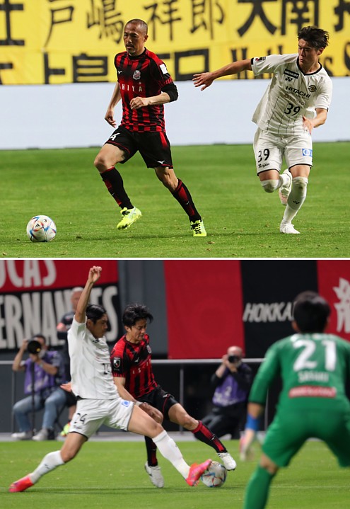 上:上段写真/後半44分、久々に途中出場した公式戦今季初出場の札幌のベテラン小野(左)が起用された直後にパスを出す、右柏FW森(39番)、森は途中出場し5、6点目を決めた