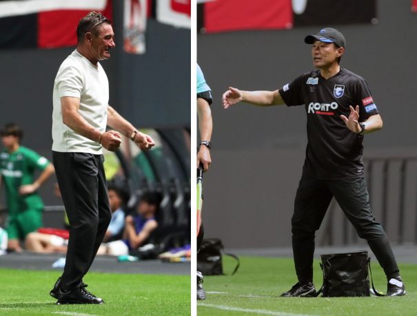 上:右側写真/後半30分、大きなジェスチャーで選手に指示を出すG大阪の片野坂知宏監督