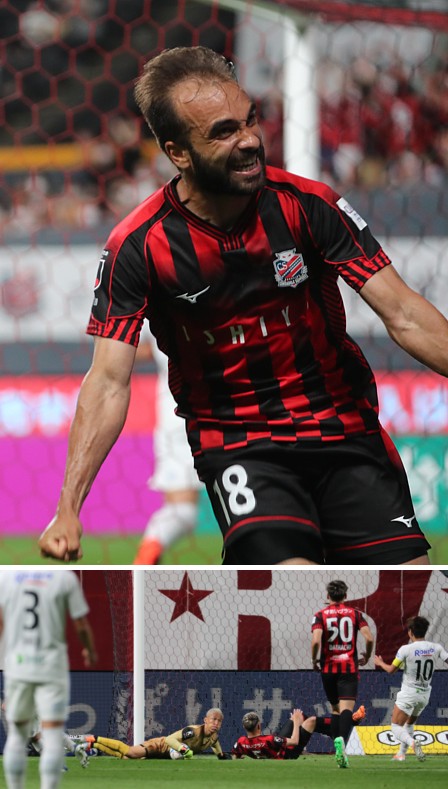上:上段写真/前半20分、札幌FWガブリエル・シャビエルが先制、思いっきりガッツポーズ、しかし、オフサイドの判定でノーゴール。得点とはならなかったが、この日のシャビエルは好守に大奮闘、勝利の立役者の一人となった