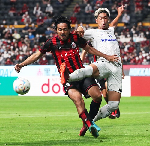 上写真/前半34分、札幌FW興梠(左)はガブリエル・シャビエルのタテパスを受けシュートしようとするが、G大阪DF三浦にクリアされる