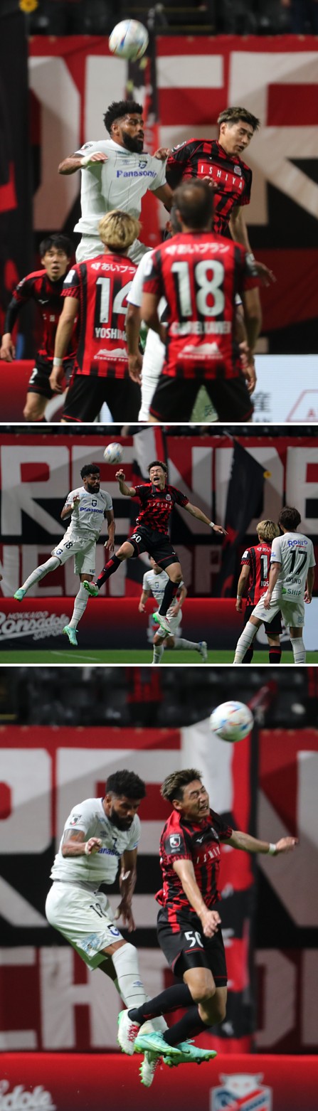 上:中段写真/前半28分、GKからのロングボールにジャンプして競る札幌のDF岡村(50番)とG大阪FWパトリック(18番)