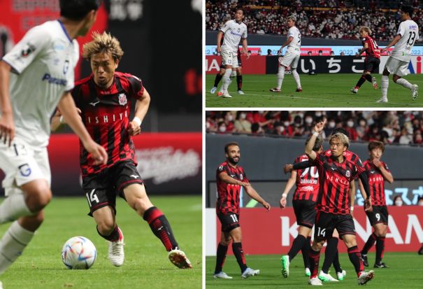 上:左側写真/後半6分、札幌MF駒井(14番)が自陣からドリブルで駆けあがる、左G大阪DF高尾(13番)。この後、右へパスを出し金子の折り返しをヘッドで決め先制する