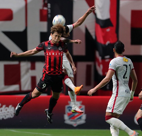 上写真/前半37分、GKからのロングボールを札幌MF金子(9番)が、鹿島MFアルトゥール・カイキとヘッドで競い合う、右手前鹿島MFディエゴ・ピトゥカ(21番)